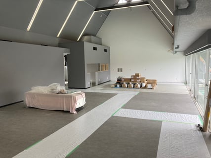 25日のサークル練習会の時に覗いてきました! 鉄パイプの足場はすっかり取り外されたクラブハウス内は、グレーを基調とした空間に生まれ変わっていました。 まだフロントカウンターは出来てないですが、カフェの窓口らしき内装がお目見えです。 この奥のスペースで寛げる日が楽しみです。 オープンまであと1週間。 完成まで本当に間に合うのか⁉ 乞うご期待。